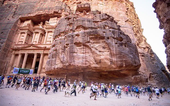 The race starts among the carved tombs and temples of Petra’s archaeological site, including the famous Treasury, before climbing through the narrow Siq canyon and out into the desert.